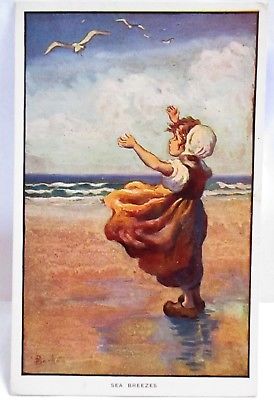 Title (ebay affiliate link): 1910 ARTIST SIGNED POSTCARD SEA BREEZE, LITTLE DUTCH GIRL & SEAGULLS