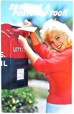 1950s POSTCARD BLONDE PINUP GIRL MAILING A LETTER