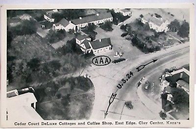 Title (ebay affiliate link): 1930s POSTCARD CEDAR COURT DELUXE COTTAGES,COFFEE SHOP CLAY CENTER KANSAS