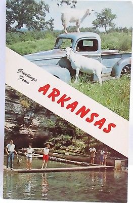 Title (ebay affiliate link): 1950s BANNER POSTCARD GREETINGS FROM ARKANSAS,GOAT AT PICKUP TRUCK