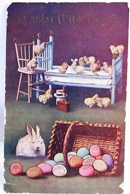 Title (ebay affiliate link): 1910 POSTCARD EASTER GREETINGS BUNNY WITH EGGS, CHICKS ON CRIB