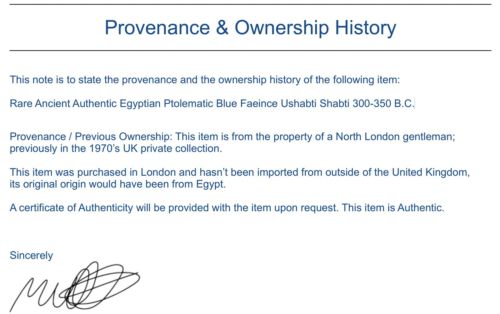 Title (ebay affiliate link): Rare Ancient Authentic Egyptian Ptolemaic Blue Faeince Ushabti Shabti 300-350 BC