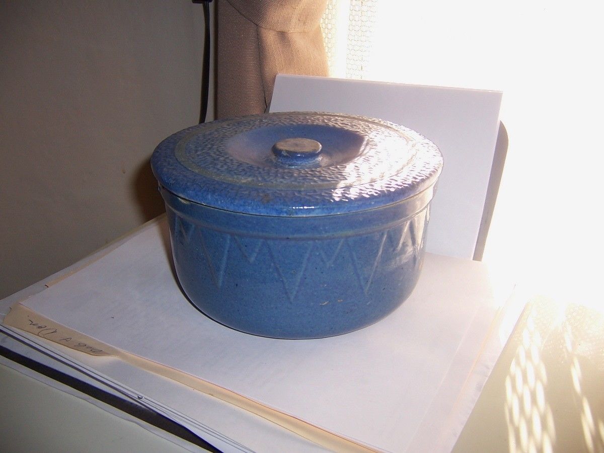 Title (ebay affiliate link): Small 1# Blue Stoneware Butter Crock angle pattern odd pattern top but fits