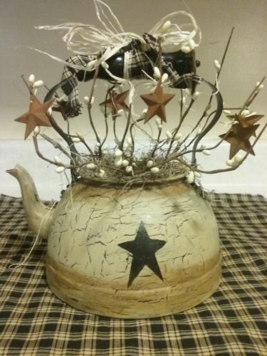 Title (ebay affiliate link): Primitive Crackle Black StarTea kettle & pip berries - Rustic Farmhouse decor