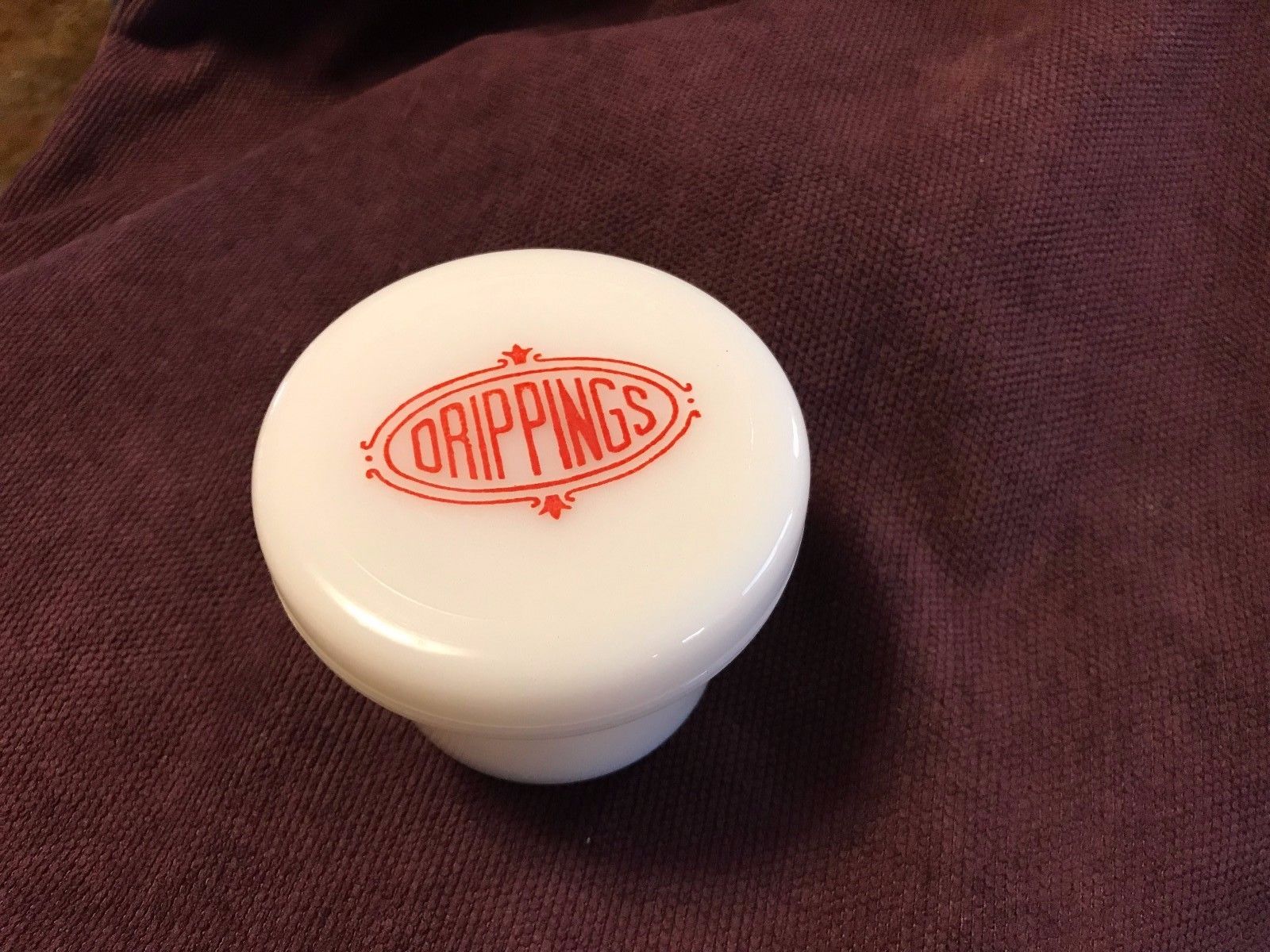 Vintage Milk Glass DRIPPINGS grease jar RED PRINT