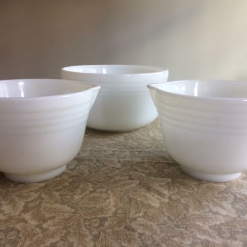 Title (ebay affiliate link): Pyrex Hamilton Beach White Ribbed Milk Glass MIXING BOWLS 1 big+2 small w/ spout