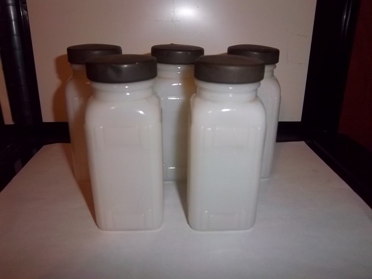 Title (ebay affiliate link): 6 Vintage Embossed *SPICE JARS* Excellent Condition Milk Glass Set w Metal Lids