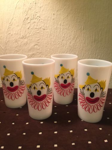 Title (ebay affiliate link): Set of 4 VINTAGE HAZEL ATLAS CLOWN GLASSES 5" TALL "IT" MILK GLASS