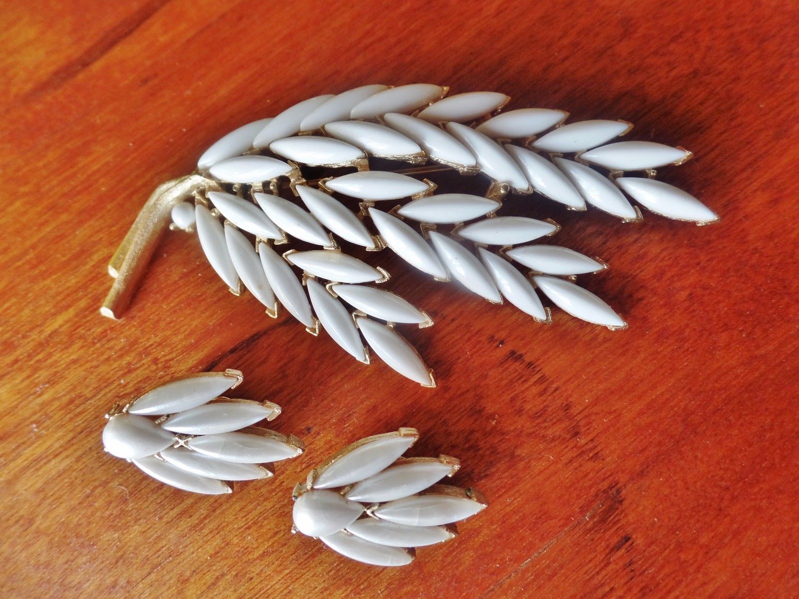Title (ebay affiliate link): Vtg Trifari signed brooch pin and matching earrings milk glass rhinestone 5"