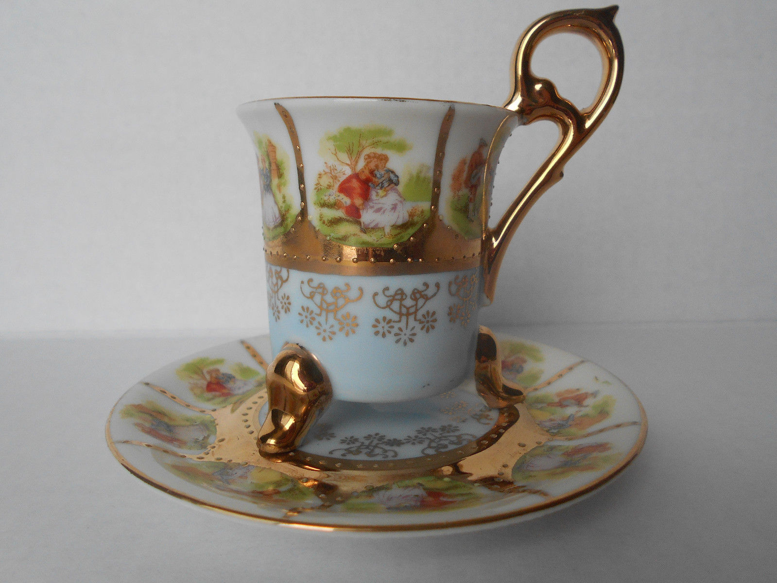 Title (ebay affiliate link): Royal Vienna style Demitasse & Saucer Fragonard Courting Couple Figural Handle