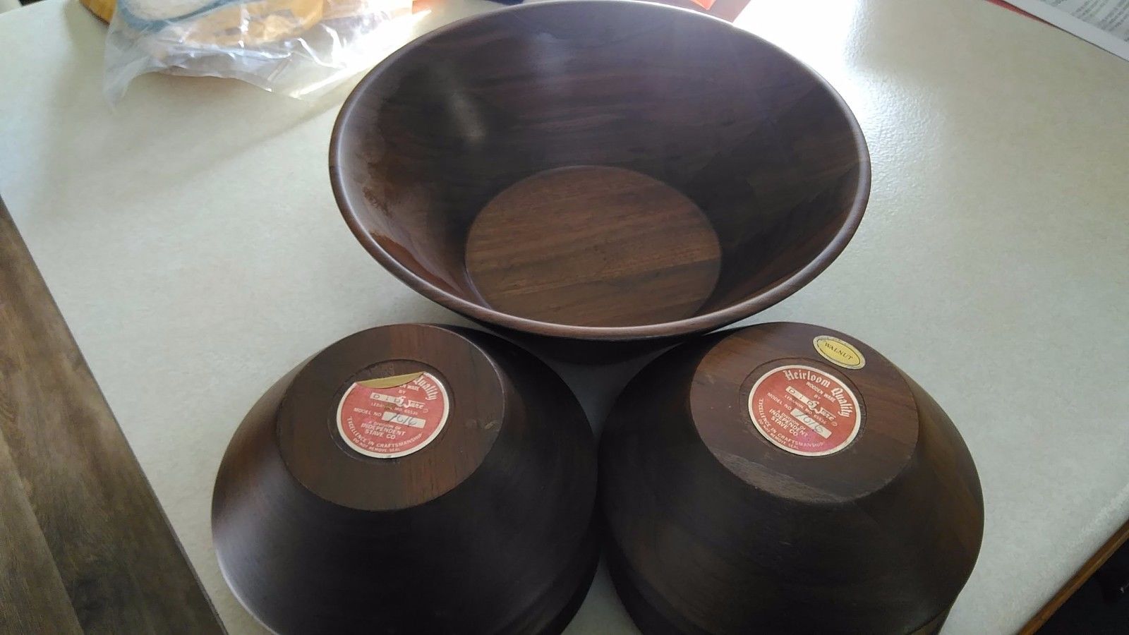 Title (ebay affiliate link): 9 Piece Set of Quality Heirloom Wooden Ware WALNUT popcorn/Salad & Mixing Bowls