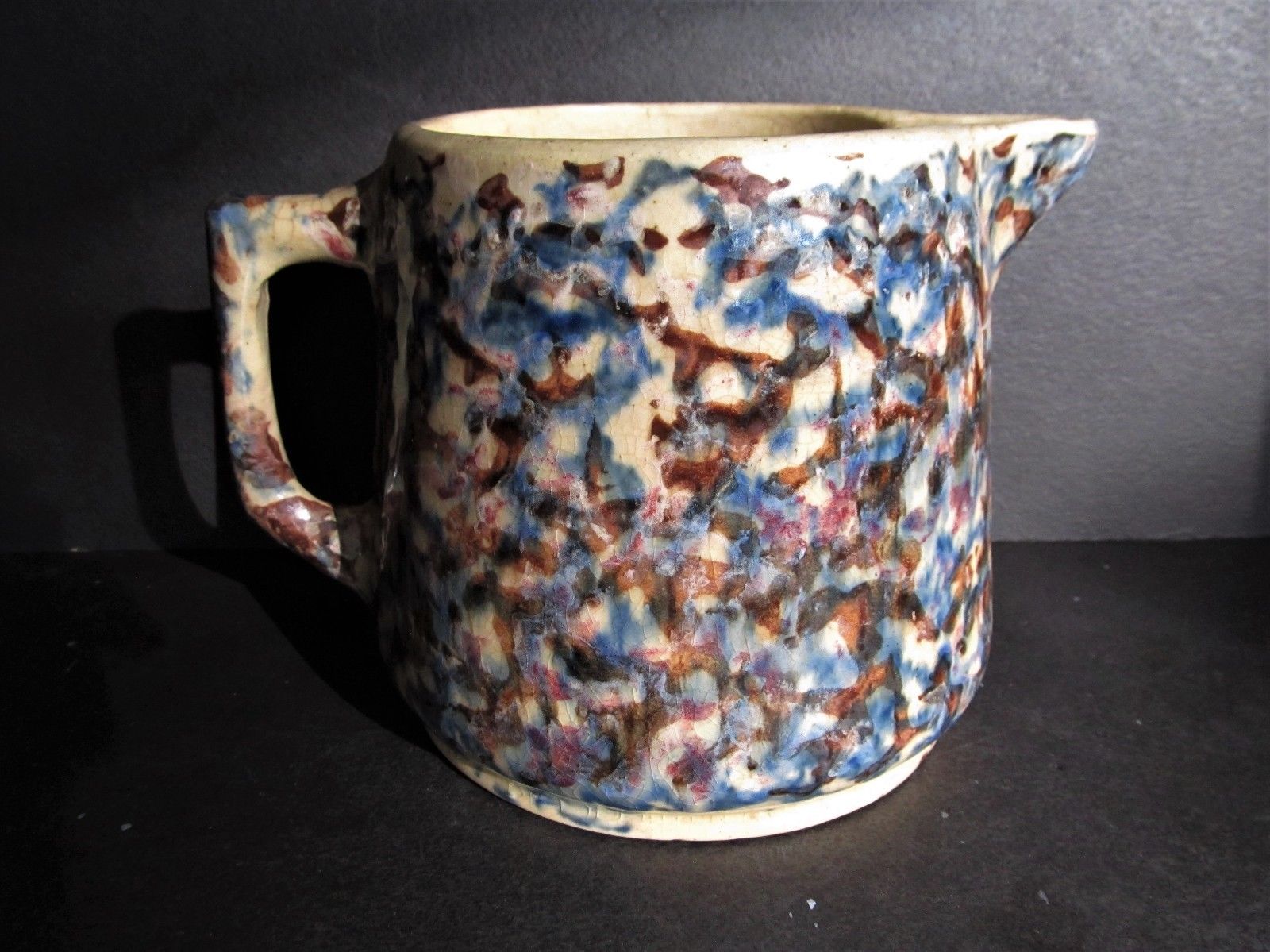 Primitive Antique Blue Red Spongeware Decorated Yelloware Pitcher