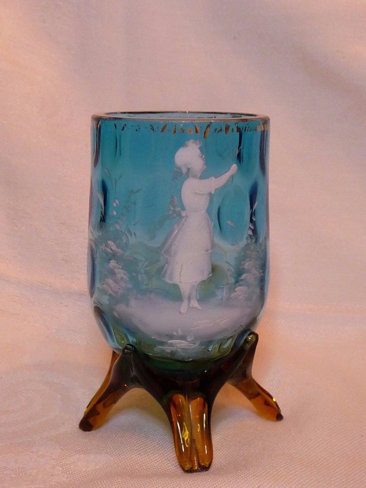 Antique MARY GREGORY Blue Glass Cup & Amber Base Four Leg Enamel Girl Scarce