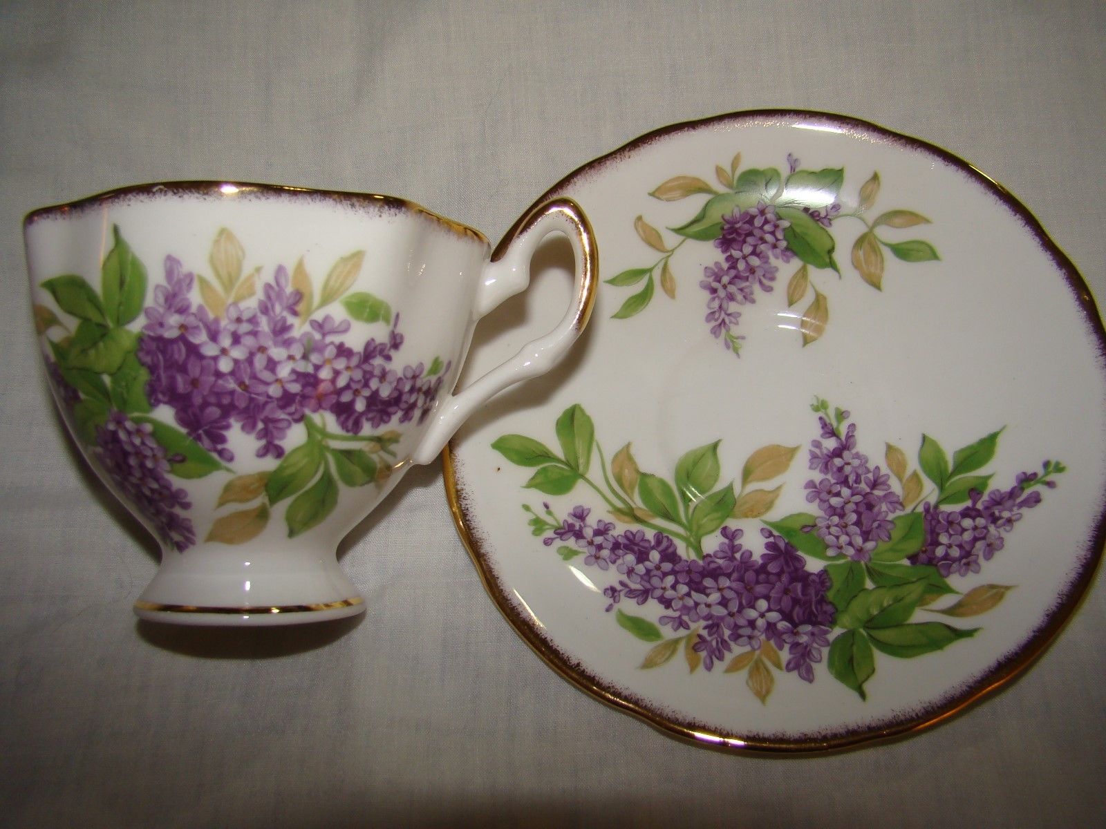 Title (ebay affiliate link): Jon Roth teacup and saucer, Salisbury England, purple on white, gold trim