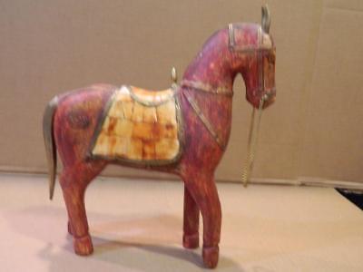 Brown Wood Hand Carved Horse w/ Bone Inlaid Saddle Antique