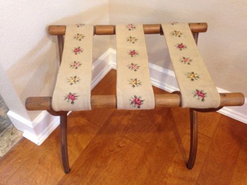 Title (ebay affiliate link): Vintage Shabby Chic Needlepoint Suitcase Stand Rose Cottage Wood Luggage Rack