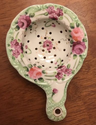Title (ebay affiliate link): Antique Porcelain TEA STRAINER - PINK and PURPLE flowers with GOLD trim #6