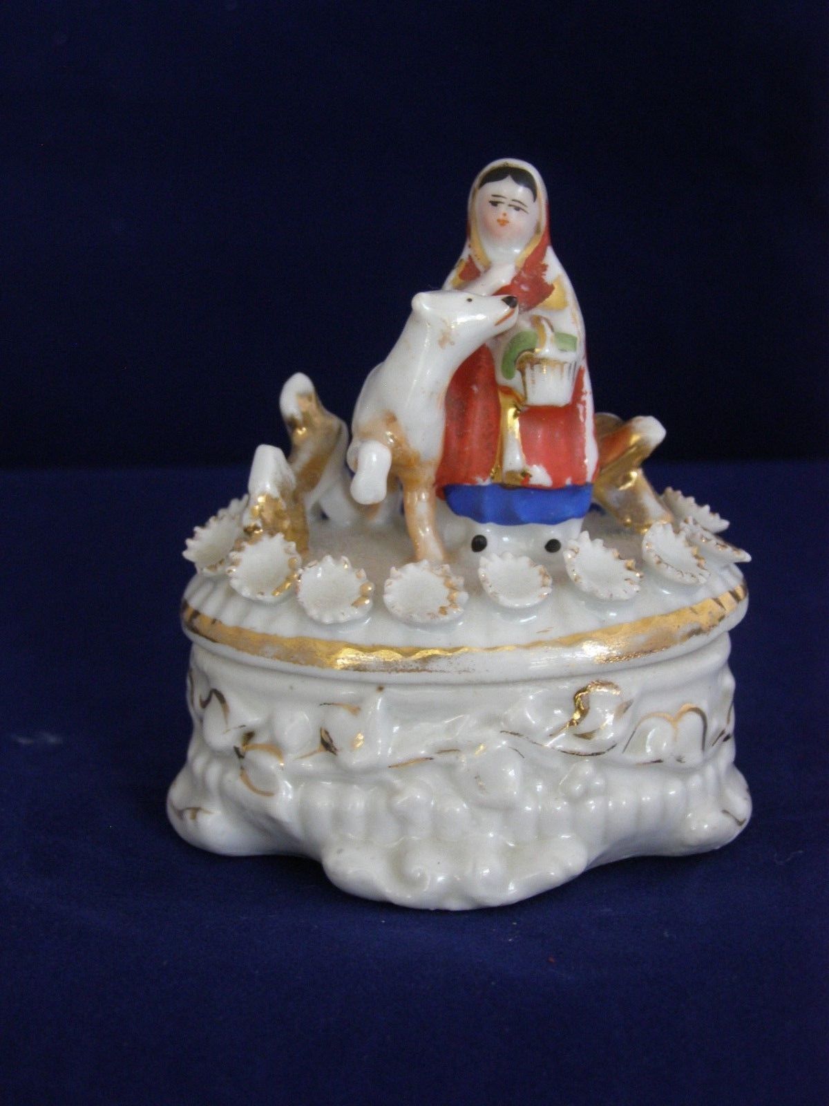 19th C Staffordshire/German Fairing Trinket Box-Little Red Riding Hood And Fox