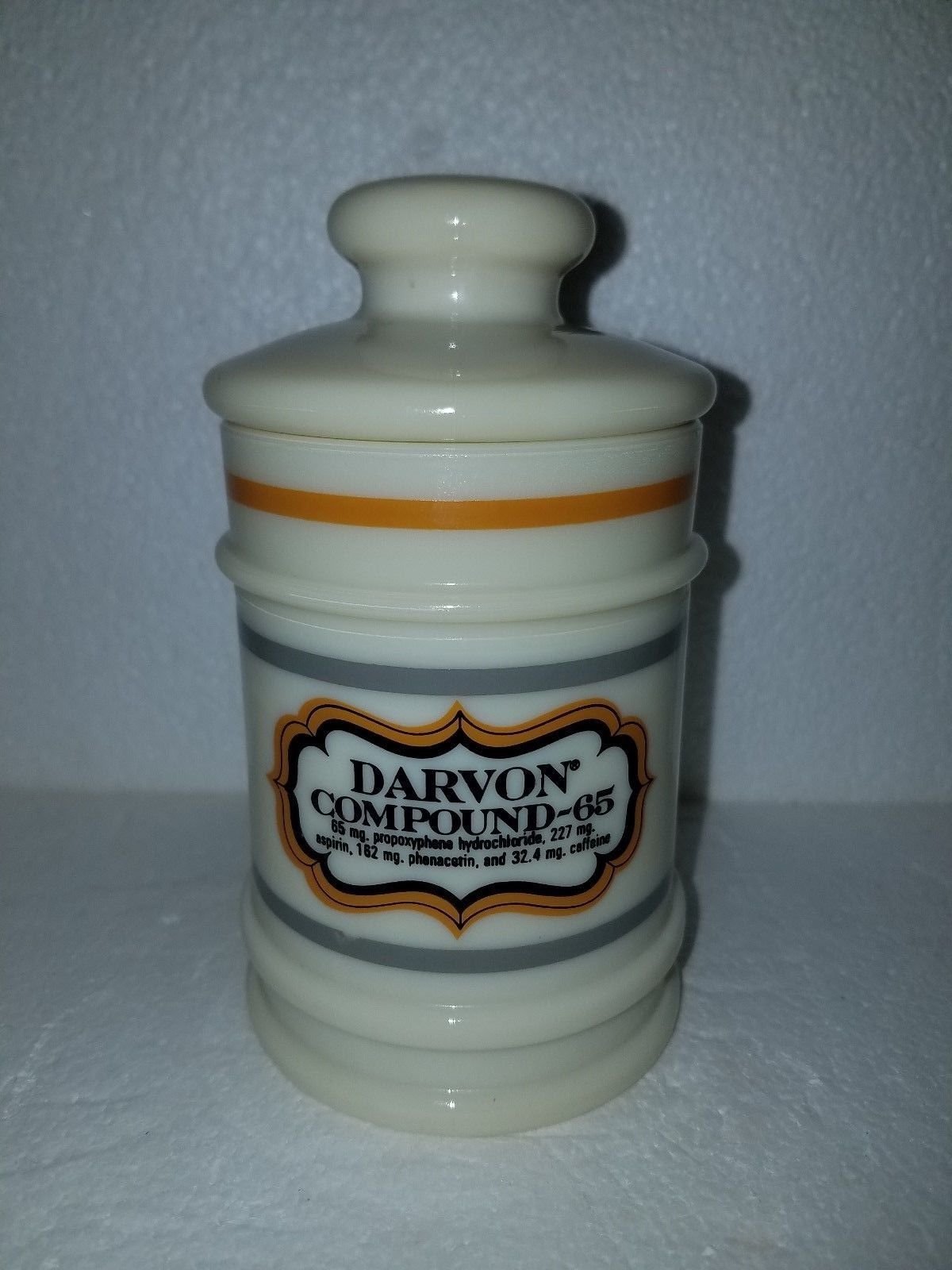 Title (ebay affiliate link): Vintage Darvon Compound-65 Milk Glass Pharmaceutical /Apothecary Lidded Jar