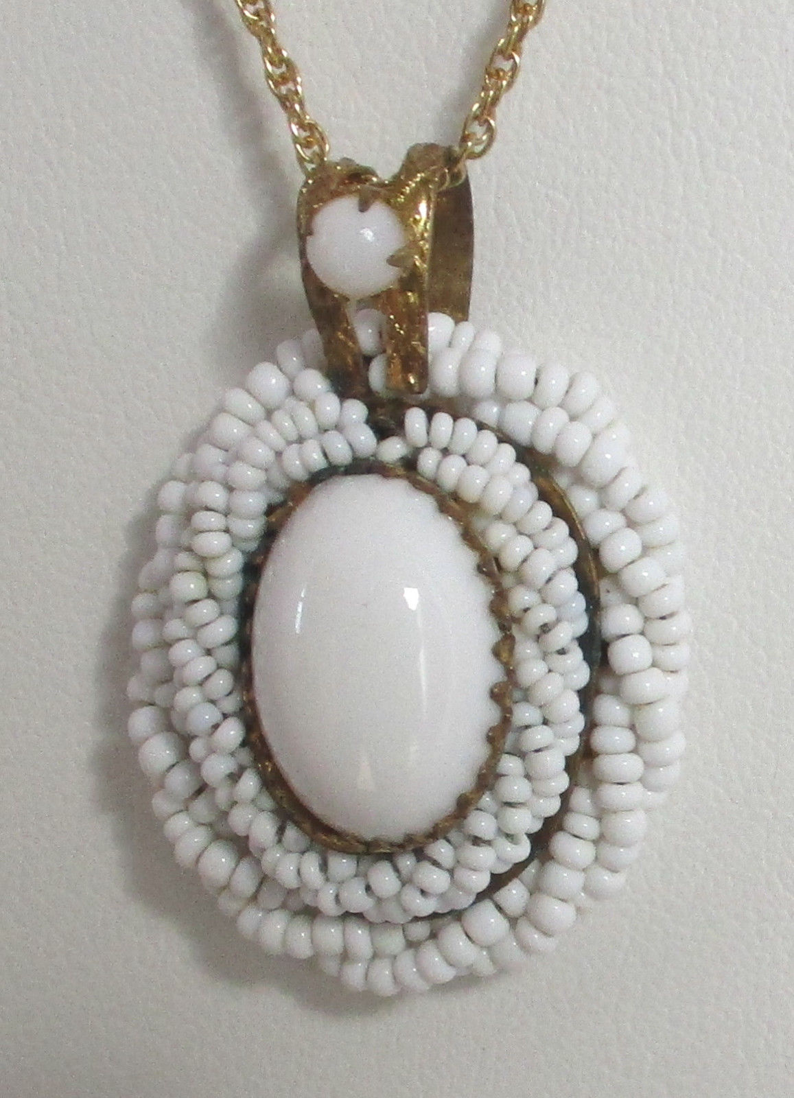 Title (ebay affiliate link): Vintage White Seed Bead/Milk Glass Cabochon Pendant Necklace