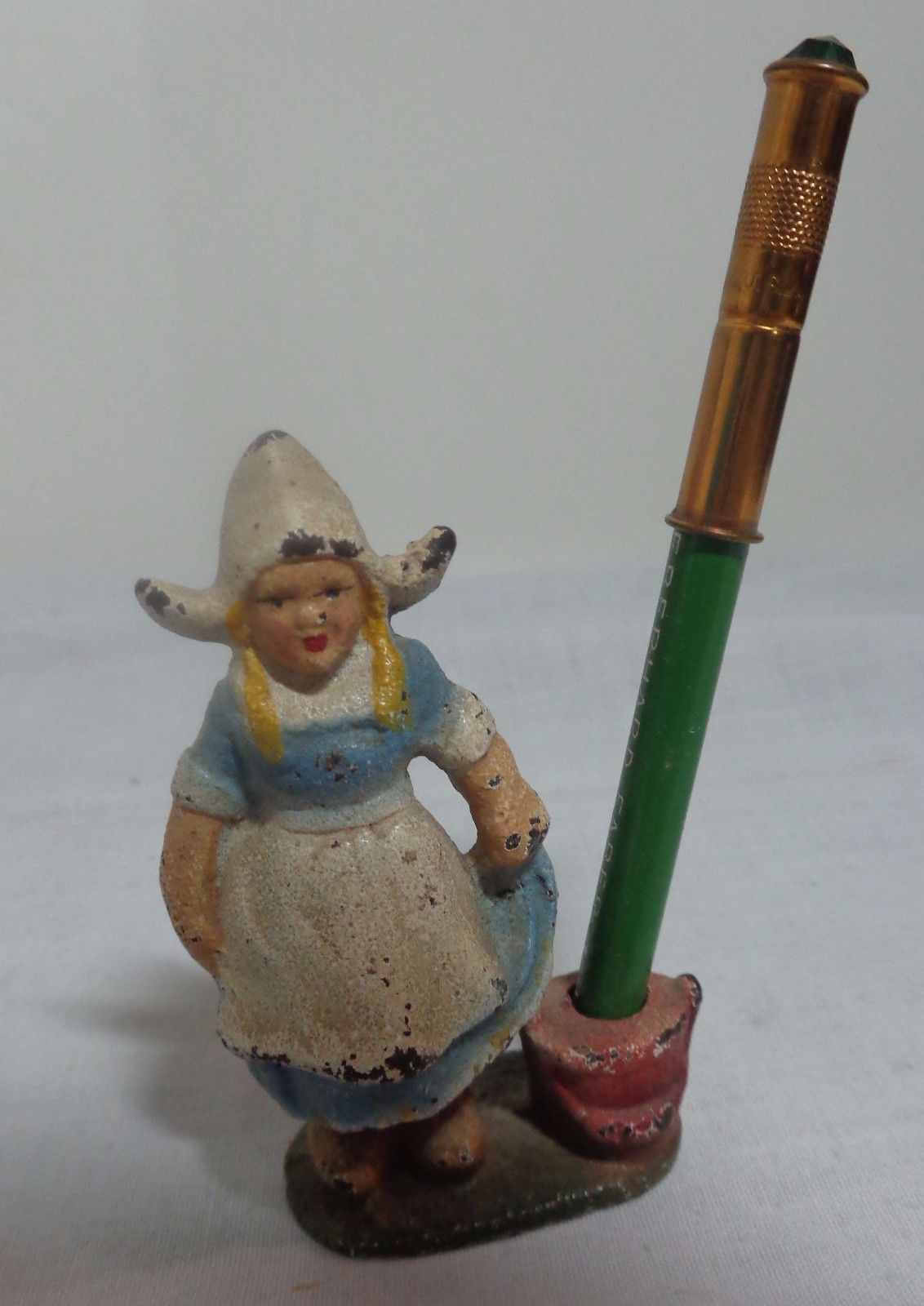 Antique Cast Iron Dutch Girl Pencil Holder / Paperweight