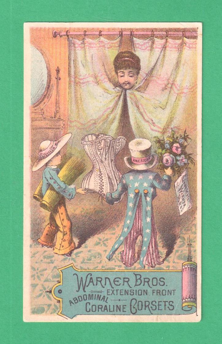 Title (ebay affiliate link): ANTIQUE TRADE CARD WARNER BROS. CORSETS LADY CURTAIN MEXICAN & UNCLE SAM BOYS