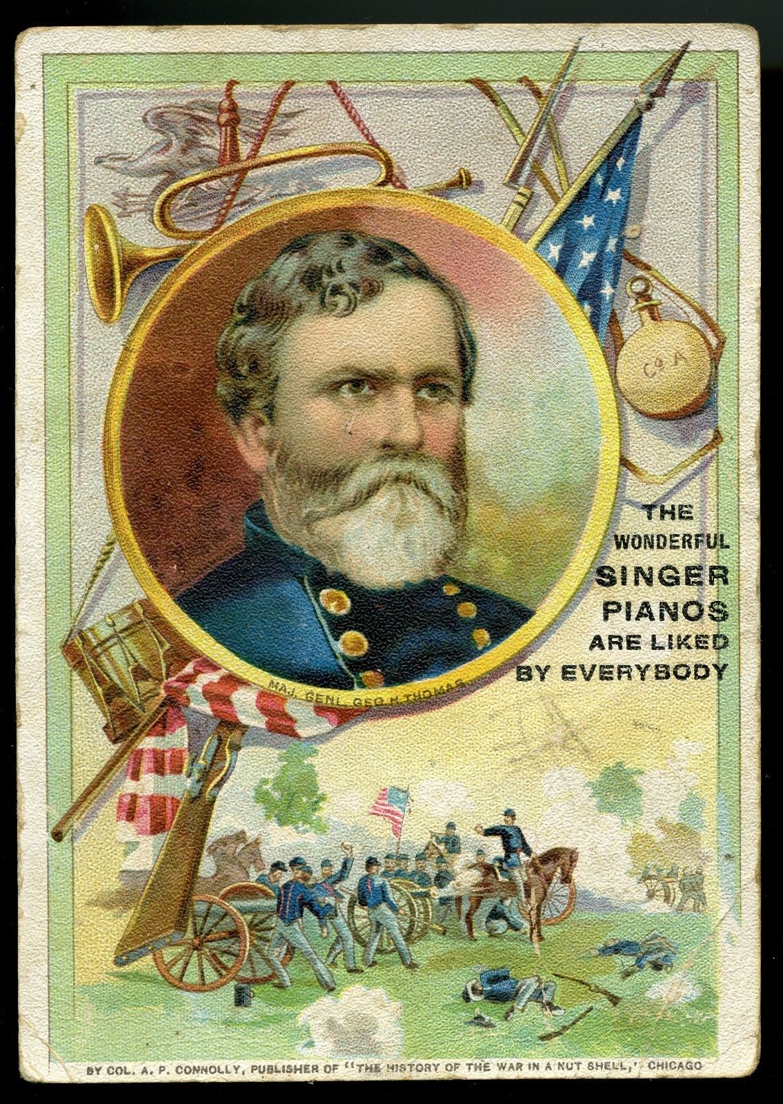VICTORIAN IMAGE OF CIVIL WAR GENERAL GEO M THOMAS, BATTLEFIELD, SINGER PIANO CO