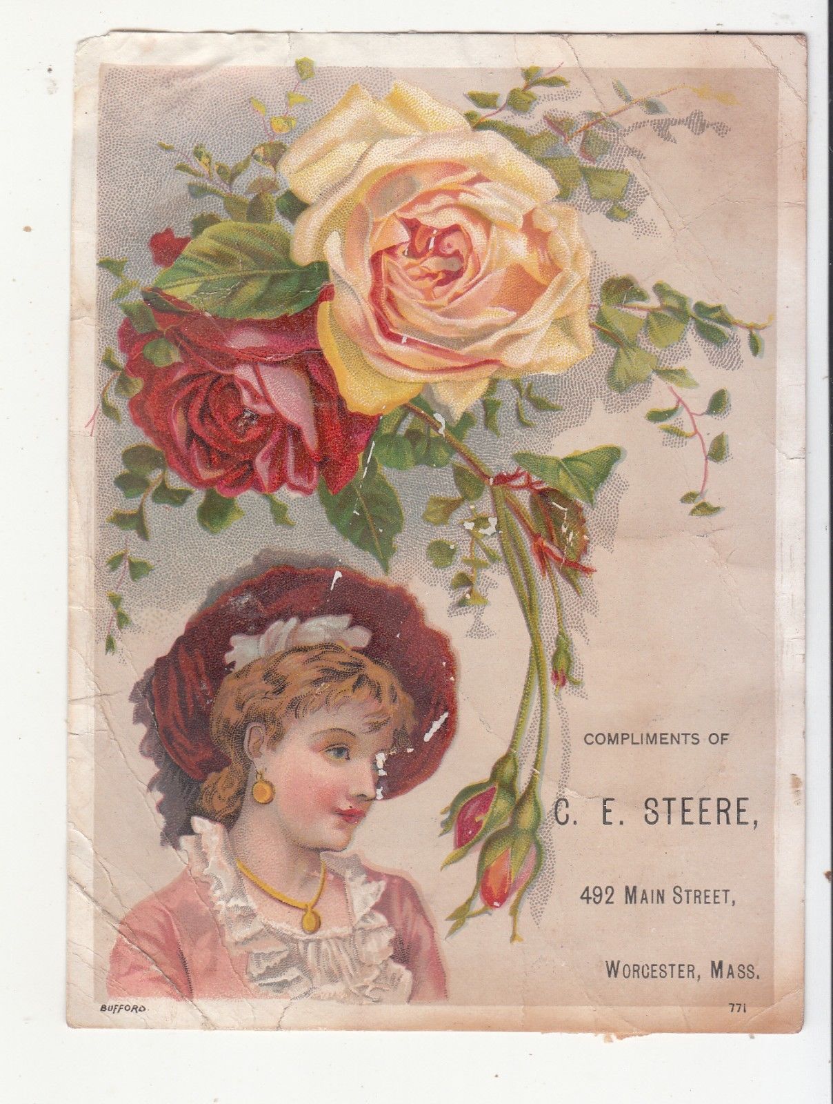 Title (ebay affiliate link): C E Steere Piano House Newby & Evans Worcester MA Roses Vict Card c 1880s