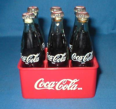6 COCA COLA 3" MINIATURE GLASS BOTTLES RED PLASTIC CASE MONTEREY MEXICO COKE