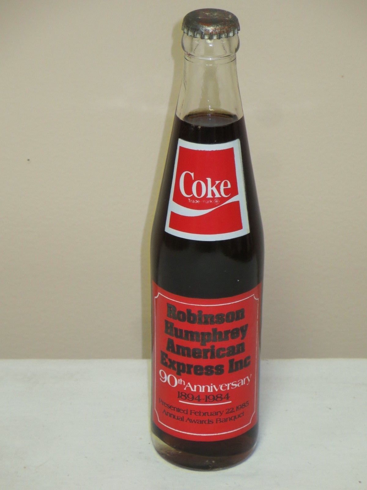 10 OZ COCA COLA COMMEMORATIVE BOTTLE - 1985 ROBINSON HUMPHREY 90TH ANNIVERSARY