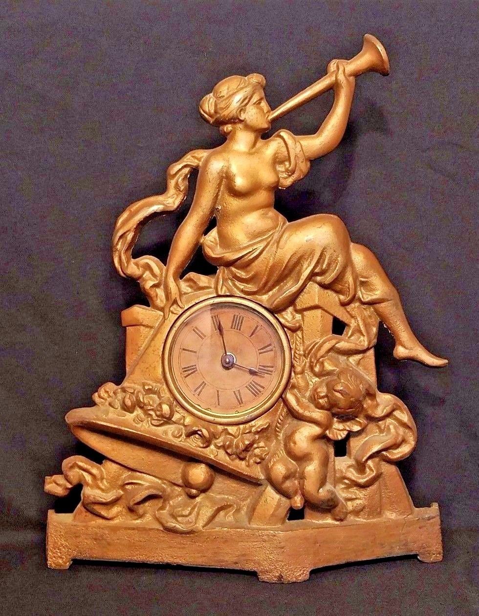 ANTIQUE VINTAGE CLOCK VICTORIAN NUDE CHERUB atop LARGE BELL CAST GOLD METAL IRON