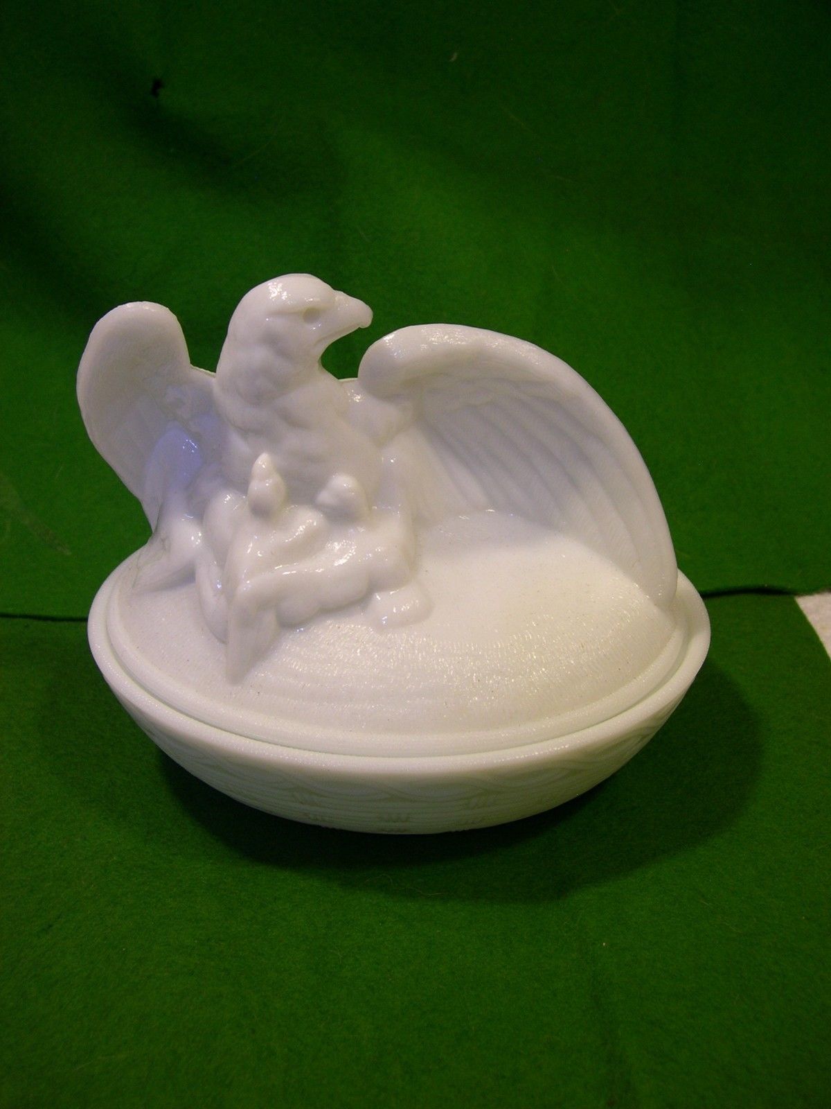 Title (ebay affiliate link): ANTIQUE WESTMORELAND MILK GLASS COVERED DISH AMERICAN EAGLE W/ CHICKS
