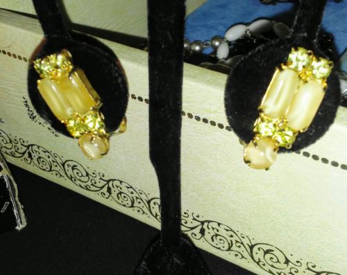 VTG YELLOW MILK GLASS & CLEAR RHINESTONE LA REL CLIP EARRINGS. BEAUTIFUL JEWELRY