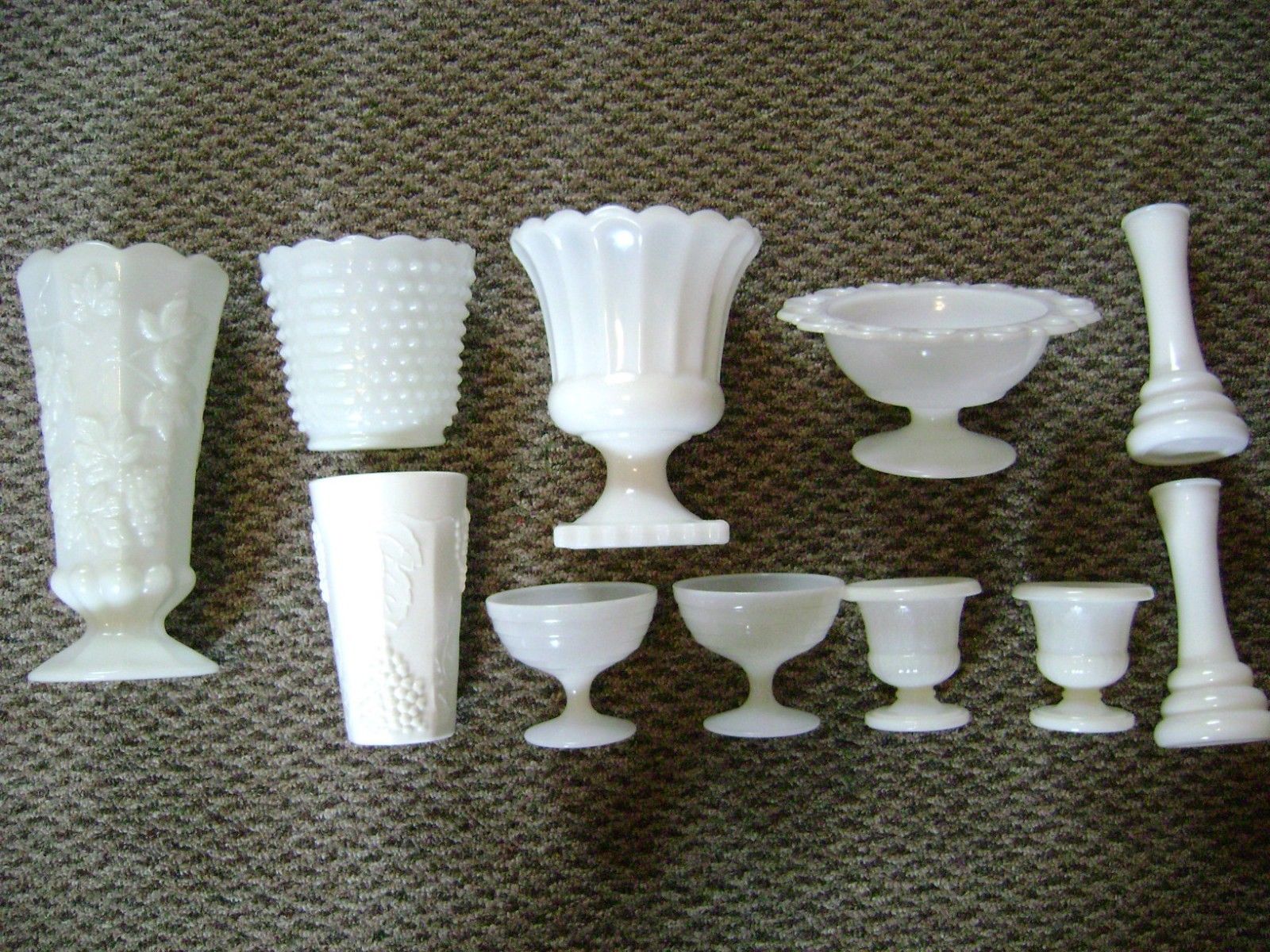 Title (ebay affiliate link): Lot of 11 vintage Milk Glass pieces. Vases, Bowl, Tumbler, etc.