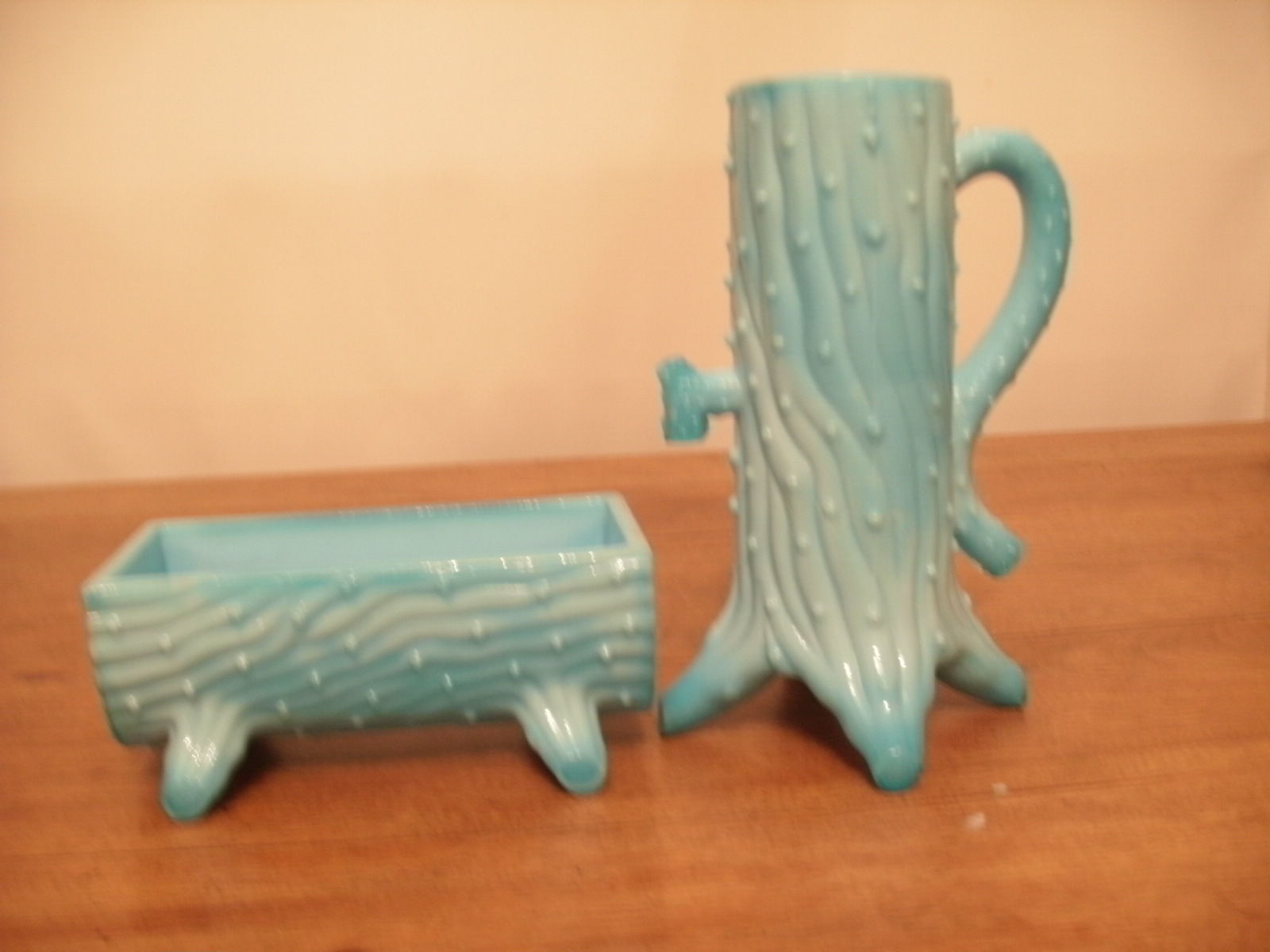 Blue Milk Glass Creamer and Sugar, Log and Pump