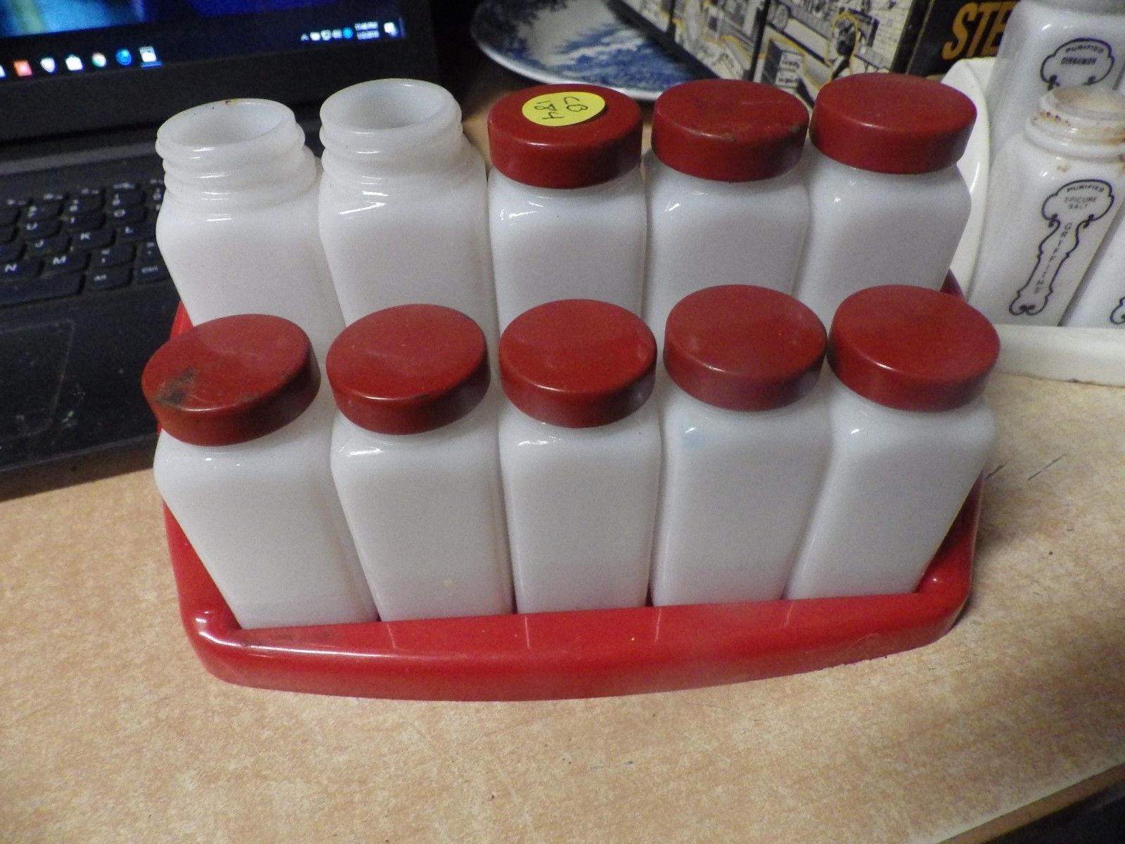 Title (ebay affiliate link): Early Art Deco Griffiths Spice Set w/Red Modern Rack Milk Glass Jars Metal Lid