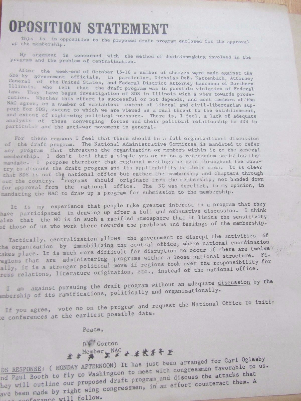Vietnam Draft Opposition Statement SDS Lee Webb NAC Radical