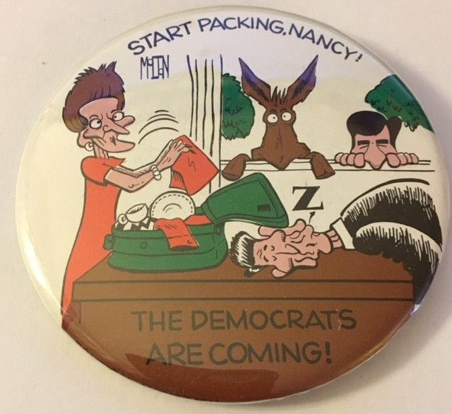 Title (ebay affiliate link): 3" Pro-Dukakis/Anti-Reagan "The Dems Are Coming" Political Pinback Button