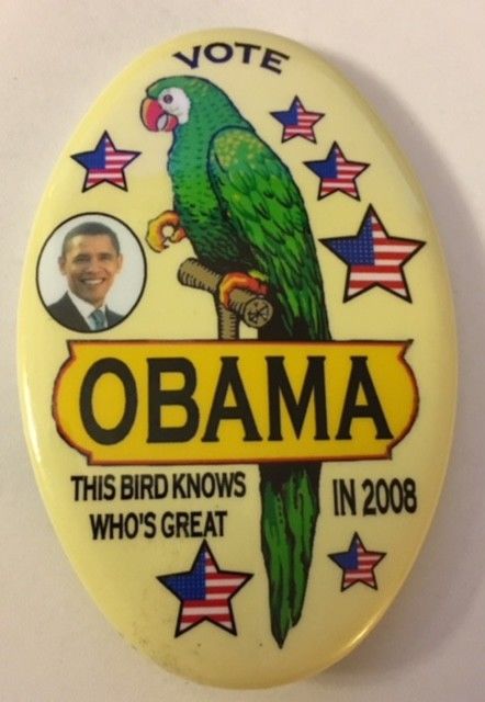 Title (ebay affiliate link): Great Oval Guardfrog Obama in 2008 "Bird Knows Best" Political Pinback Button