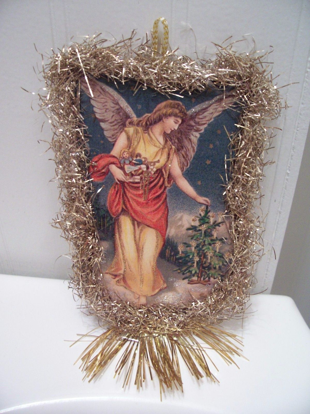 Title (ebay affiliate link): Antique Look Christmas Ornament, ANGEL with TREE & TOYS, Scrap,Tinsel, Handmade