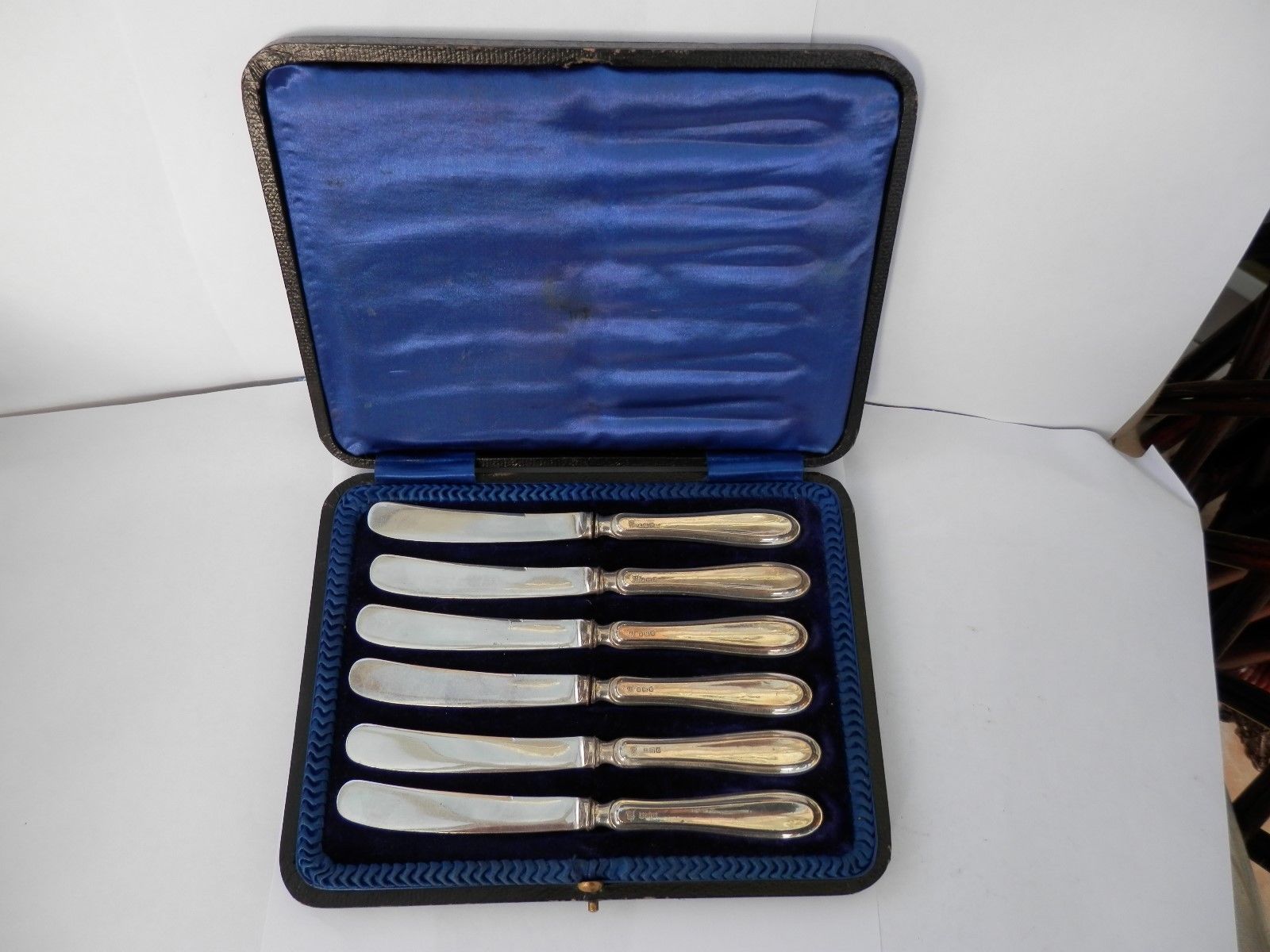 Title (ebay affiliate link): Antique Cased Set of 6 Silver Handled Butter Knives by Cooper Brothers