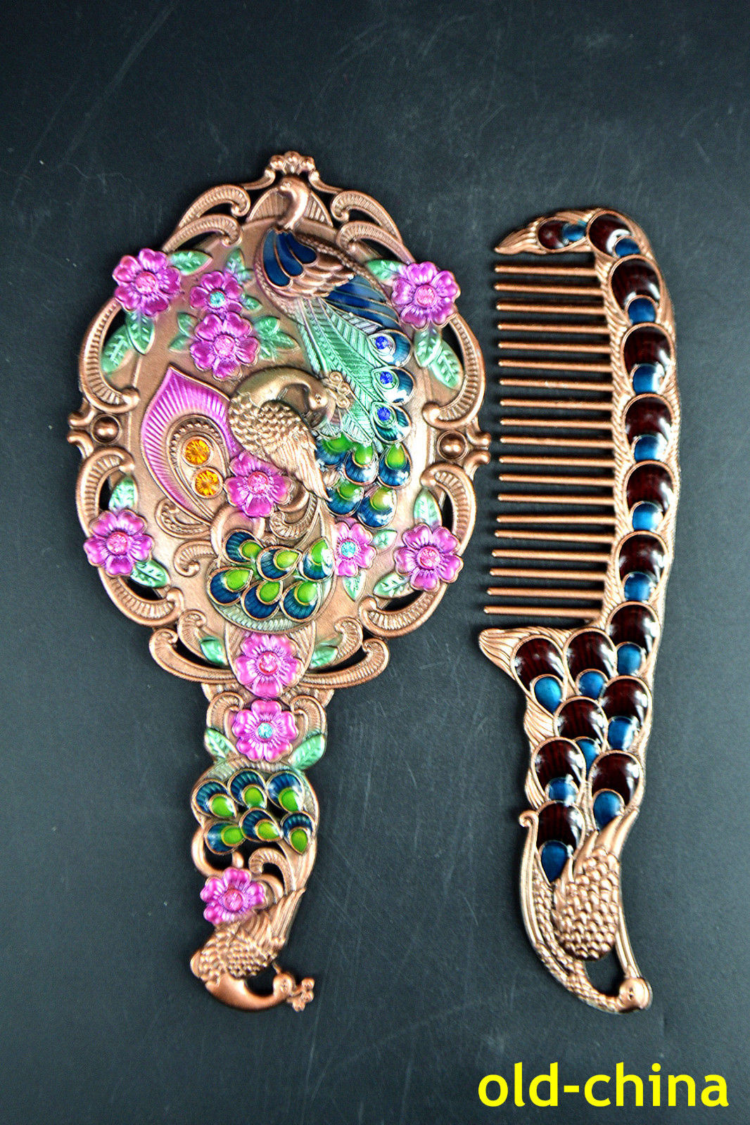 Title (ebay affiliate link): Beauty Antique Cloisonne hand peacock Colored carved comb mirror Statue women