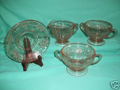 Title (ebay affiliate link): 2 Suger, Creamer and Saucer Pink Depression Sharon Rose