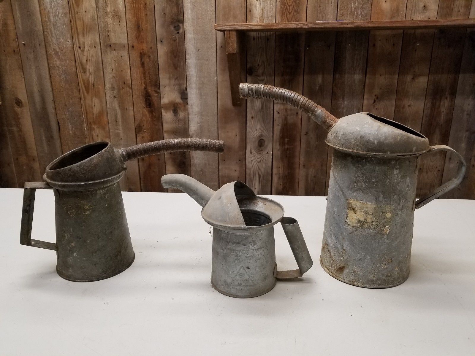 3 Old Vintage Galvanized Metal Oil Cans ~ Primitive Industrial Rustic Decor Tool