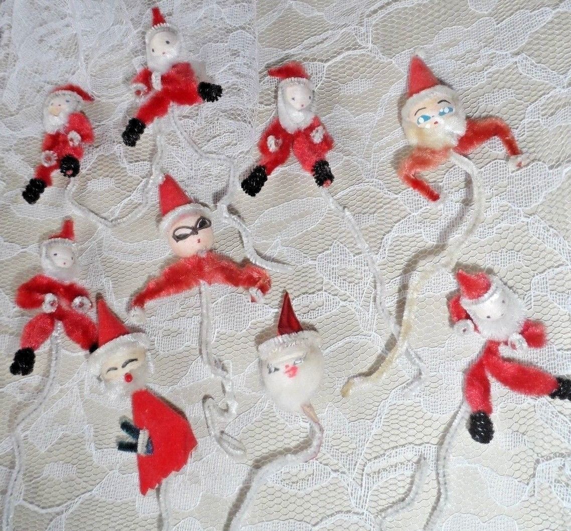 Vintage Christmas Ornaments - NINE SPUN COTTON & CHENILLE SANTA PICKS - JAPAN