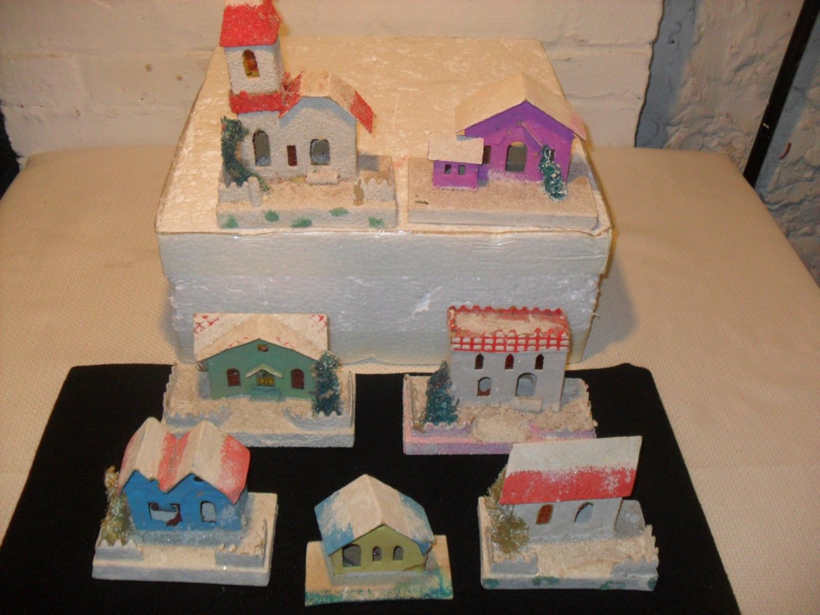 Title (ebay affiliate link): VINTAGE LOT OF 7 PAPER MACHE MADE JAPAN CHRISTMAS HOUSE HOUSES DECOR XMAS