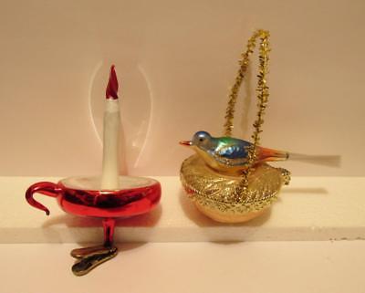 Lot of 2 VTG. CLIP-ON BLOWN GLASS CANDLE & BIRD ON NEST CHRISTMAS ORNAMENTS