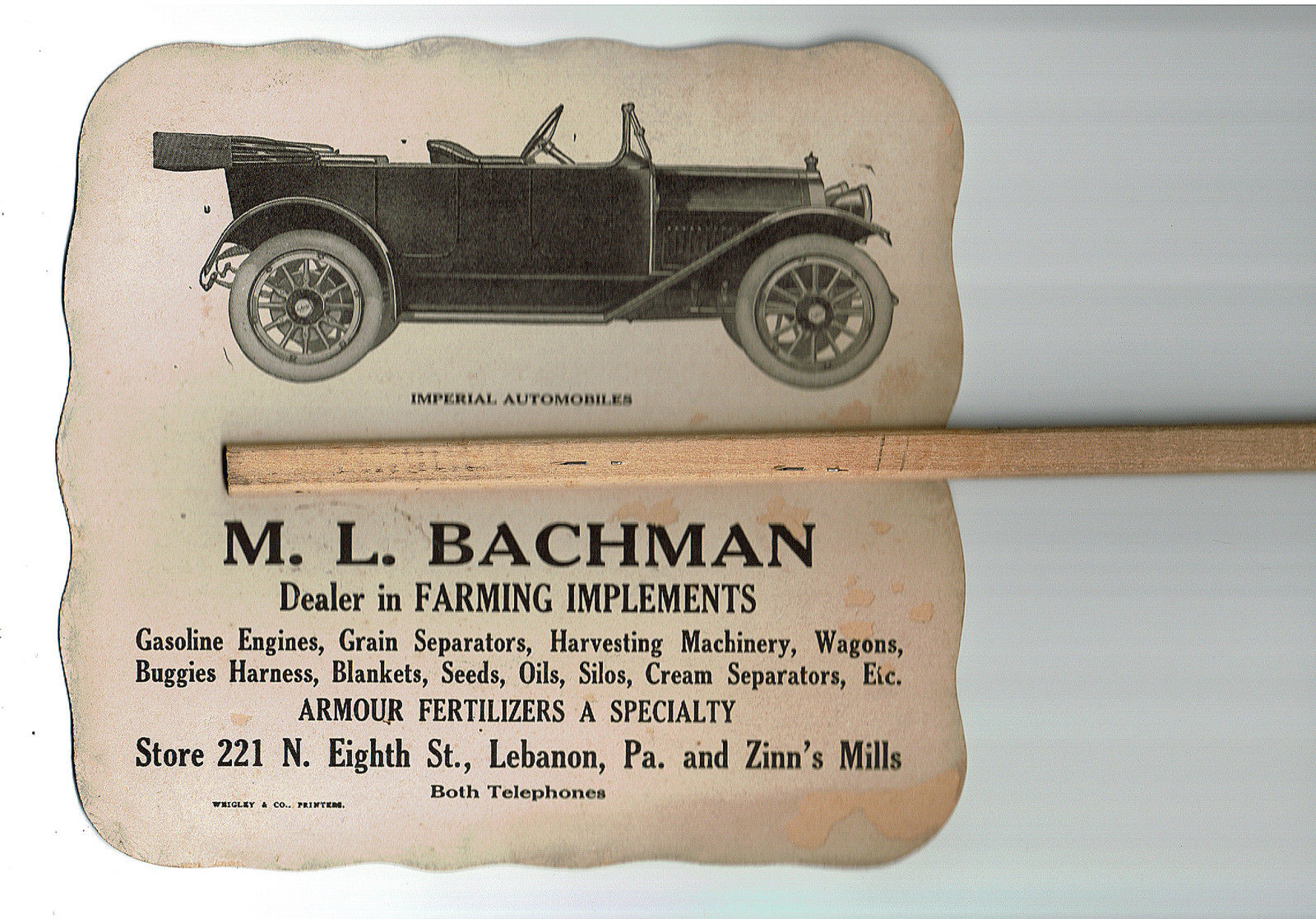 Advertising fan Imperial Automobiles M. L. Bachman Lebanon, Pa. Zinn''s Mills