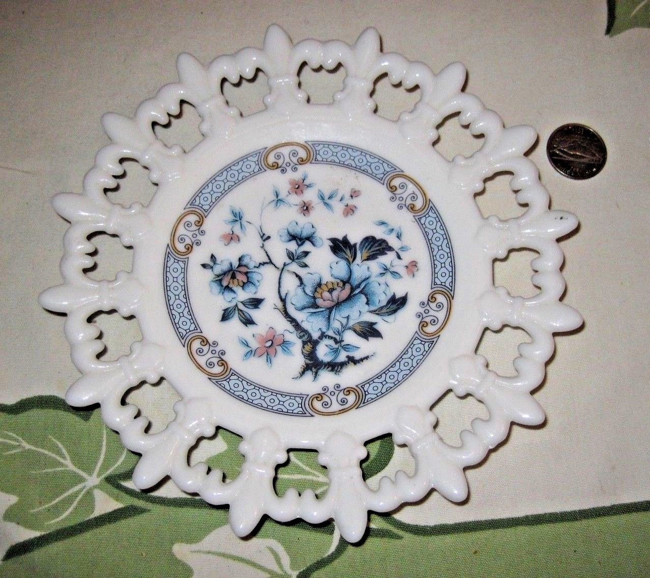Title (ebay affiliate link): Vintage white Milk Glass Plate Fleur De Lis 7.5 inch Lace Lattice blue flowers