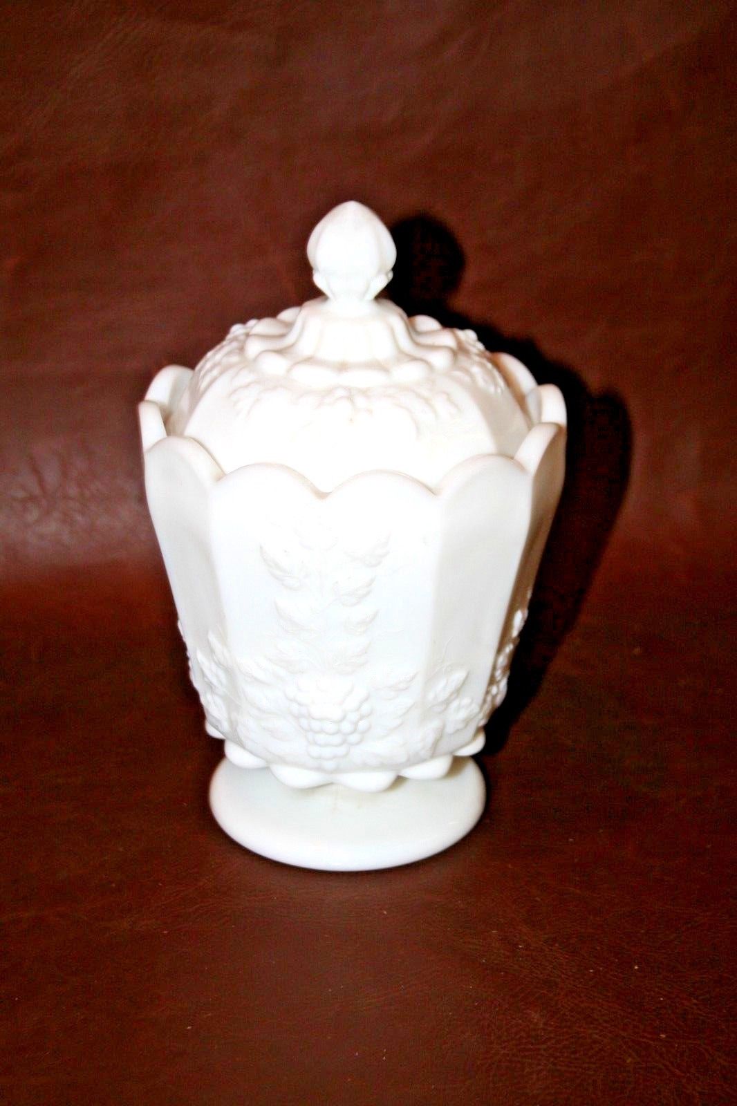 Title (ebay affiliate link): Vintage 7" Tall Pressed Milk Glass Covered Candy Jar Dish w/ Grapevine Decor